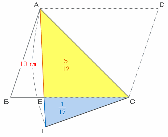 次の図の三角形ACFの面積は平行四辺形の2分の1、そして折ったら重なった部分である三角形AECの面積は平行四辺形の12分の5なので、三角形CFEの面積は平行四辺形の2分の1-12分の5=12分の1にあたります。