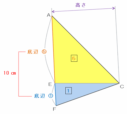 三角形AECとCFEの面積比は5:1なので、下の図の辺AEとEFの長さの比も5:1になります。