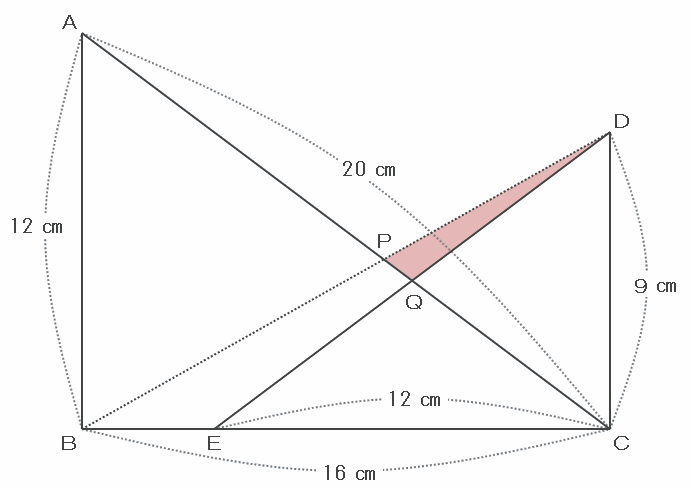 さっきの問題で、三角形QECは底辺ECが12㎝、そして高さQRが4.5㎝となることが分かったので、面積は12×4.5÷2=27㎠です。