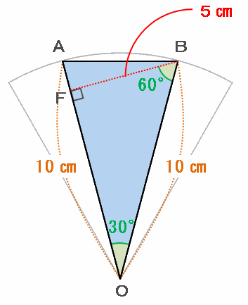 このとき、上の図の三角形OBFは正三角形を縦にスパッと半分に切った形になっているので、辺BFの長さは辺OBの半分である5㎝になります。