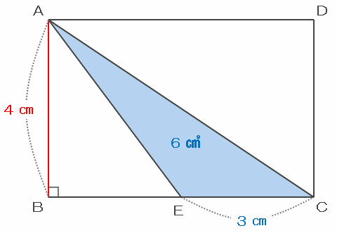 次の図の三角形AECは、底辺がEC=3㎝で高さがAB=4㎝なので、面積は3×4÷2=6㎠です。