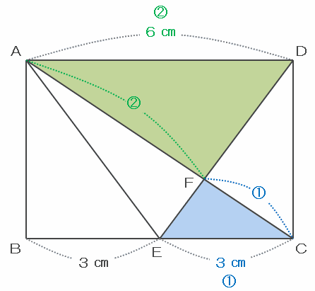 次の図の三角形AFDとCFEは8の字相似の関係なので、辺ADとECの長さの比が6㎝:3㎝=2:1なら、辺AFとFCの長さの比も2:1になります。