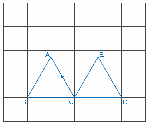 図のように、1㎝の方眼の上に正三角形ABC、正三角形ECDがあります。その正三角形の1辺の長さはともに2㎝で、Fは辺ACを2等分する点です。この方眼の上に、3つの点G、H、Iを三角形GBD、HAF、IFCがどれも正三角形になるようにとります。ただし、点HとIは正三角形ABCの辺上にはとらないものとします。