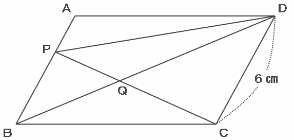 次の図のようなDCの長さが6㎝の平行四辺形ABCDがあります。点Pは辺AB上を動き、PCとBDの交わる点をQとします。APの長さが1㎝のとき、三角形PQDの面積は15㎠です。このとき、次の各問いに答えなさい。