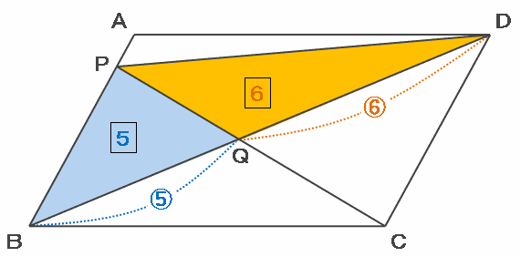 次は下の図のように三角形PBQとPQDに注目してみると、この2つの三角形は底辺がBQ:QD=5:6で高さは等しいので、面積比は底辺比と同じく5:6になります。