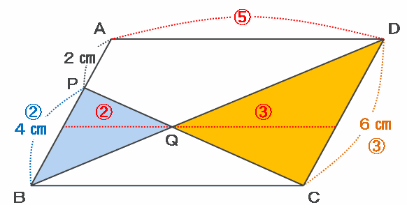 辺APの長さが2㎝のとき、辺PBの長さは6-2=4㎝になるので、三角形PBQとCDQは長さの比がPB:DC=4㎝:6㎝=2:3の8の字相似になります。