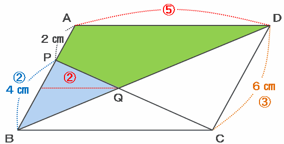 このとき、下の図の三角形PBQとABD、そして四角形APQDの面積をそれぞれ比で表してみると、