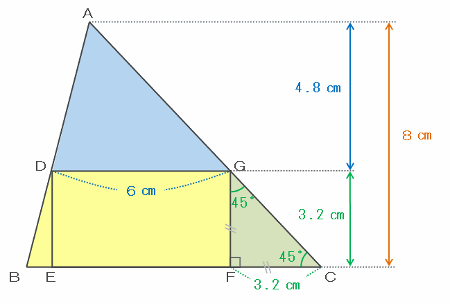 次の図の三角形ABCの高さは8㎝、ADGの高さは4.8㎝なので、辺GFの長さは8-4.8=3.2㎝です。