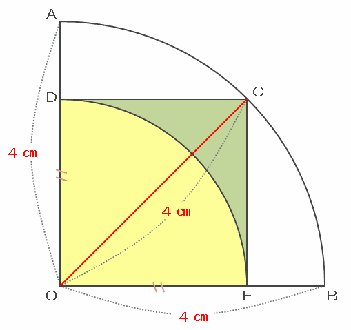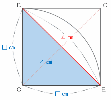 次の図の辺DEも、OCと同じく正方形DOECの対角線なので長さは4㎝です。