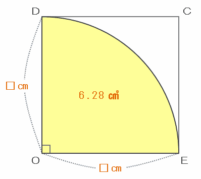 また、次の図のおうぎ形ODEの面積は「DO×OE×3.14÷4」を計算すれば求められるので、その式の「DO×OE」の部分に「8」をあてはめて計算してみると、8×3.14÷4=6.28㎠になります。
