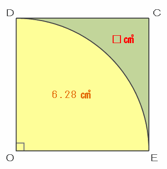 次の図の正方形DOECの面積は8㎠、そしておうぎ形ODEの面積は6.28㎠なので、この問題で求めたい緑色の部分の面積は8-6.28=1.72㎠になります。