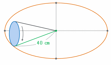 円すいを次の図のように転がすと、底面の青い円がちょうど4周したときに元の位置へ戻るので、底面の青い円の円周の長さは、半径40㎝の円の円周の長さの4分の1と等しいことが分かります。