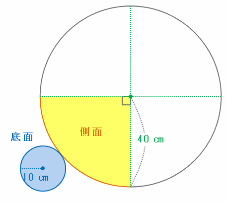 また、底面の青い円の円周は下の図の大きな円の円周の4分の1なので、底面の円の半径は大きな円の半径の4分の1にあたる10㎝です。