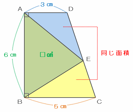 次の図の台形ABCDにおいて、三角形AEDと三角形EBCの面積は等しくなっています。このとき、三角形ABEの面積は何㎠ですか。