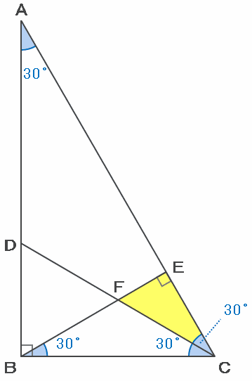 下の図の三角形EBCとEFCは、3つの内角が30度、60度、90度の直角三角形、そして三角形FBCは辺FB=辺FCの二等辺三角形になっています。