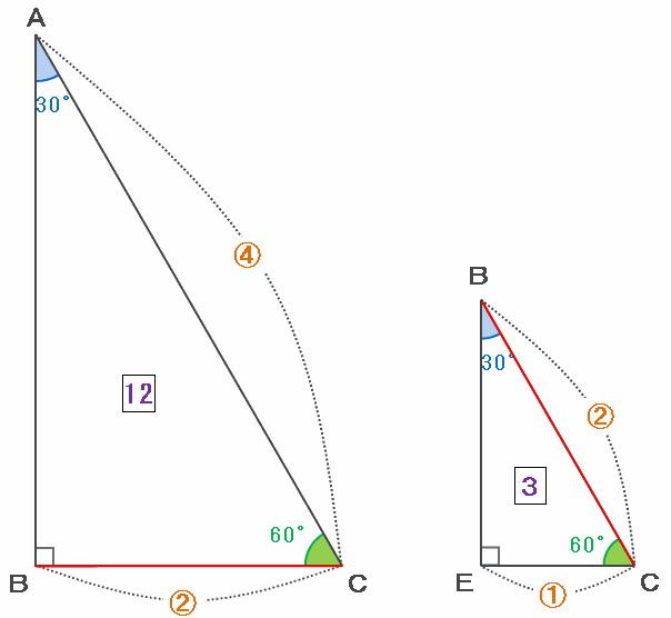 今度は下の図のように、三角形ABCとBECを並べて比べてみると、この2つの三角形はどちらも斜辺が底辺の2倍になっているので、辺ECの長さを①とおくと辺BCの長さは①×2=②、そして辺ACの長さは②×2=④と表せます。