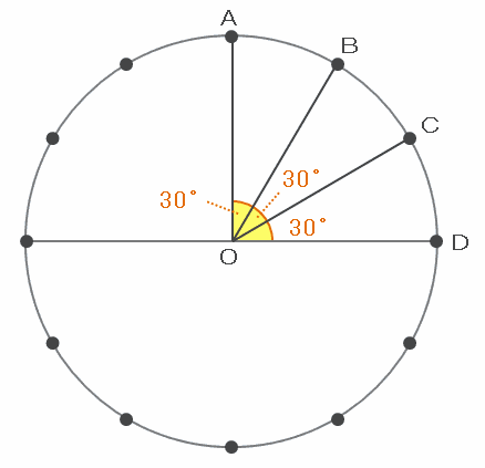 円周上には等間隔で12個の点があるので、次の図の角AOB、BOC、CODなどはどれも360÷12=30度ずつになります。