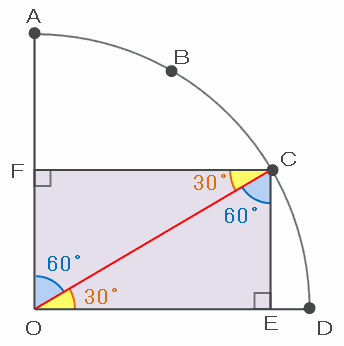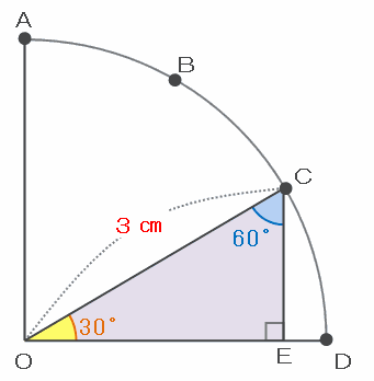 次の図のように、点Cから辺ODへ垂直な線を引くと、角OCEは180-(30+90)=60度になるので、三角形OCEの3つの内角は「30度・60度・90度」です。