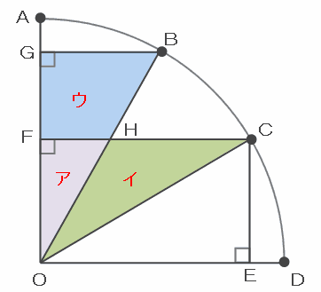 また、三角形COFは図のア+イ、OBGはア+ウなので「ア+イ=ア+ウ」であり、しかも=の左右にアが1個ずつあるので、イとウの面積が等しいことも分かります。