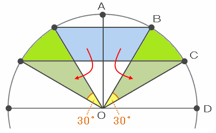 面積の等しい部分を次の赤い矢印のように移してみると、求める面積は半径3㎝で中心角30度のおうぎ形2つ分と等しくなります。