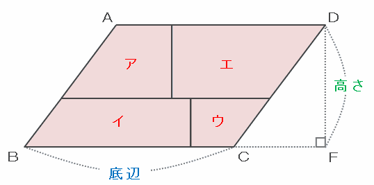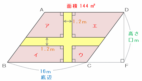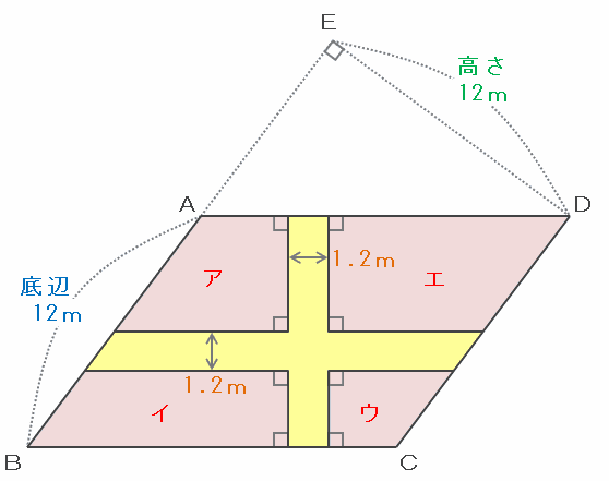 道の幅は2本とも1.2mなので、次の図のように4か所の花だんア~エだけをくっつけて平行四辺形にしたとき、この平行四辺形の底辺と高さは、道路があったときに比べてどちらも1.2mだけ短くなります。