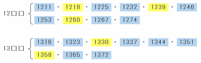 「あー、もし他の場合も7個ずつだったらうれしいんだけどなー」と心の中でひっそり思いつつ、同じように「12□□」と「13□□」の中で条件にあてはまる数を調べてみると、次の図のようにやはり7個ずつあります。
