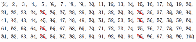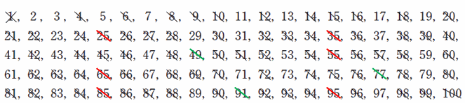 花子さんは1から100までの整数にどのような素数があるのかを調べることにしました。1は素数ではないのでまず1を消し、そのあと2以外の2の倍数、3以外の3の倍数、・・・を次々に消していきました。