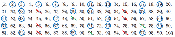 以上から、1から100までの中にある素数は、次の図の青い○で囲った25個になります。