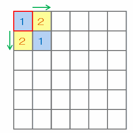 また、さっき「1」をあてはめたマスの右と下には「2」を、そしてななめ下には「1」をあてはめます。