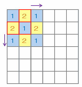 なので、使われた数の差をなるべく小さくするために、「1」の右と下には「2」を、そしてななめ下には左上と同じく「1」をあてはめておきます。