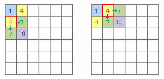 そのルールに従って、次の図のいちばん左上のマスに「1」をあてはめてから、右と下のマス、ななめ下のマスにあてはめる数を決めていくと、