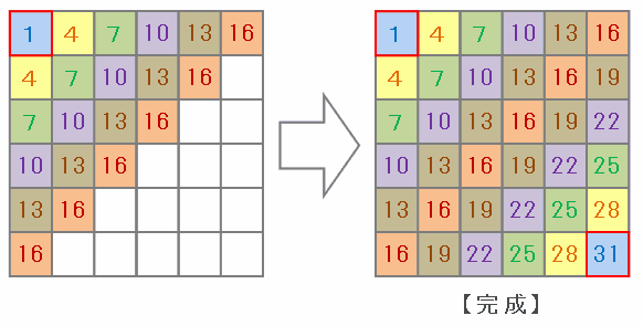 なお、完成した図のいちばん右下にあるマスの数は、いちばん左上にあるマスの数より31-1=30大きくなっているはずです。