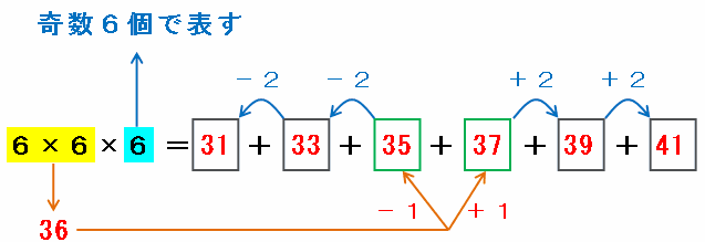 同じように「6×6×6」の場合を考えてみると、「6×6」の答えである36を6個ならべればOKなので、次の図のように真ん中に36-1=35と36+1=37を置き、その左右に連続する奇数を2個ずつならべれば36が6個になります。