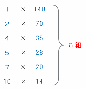 その12個を、次の図のように「A×B」の答えが140になるようなペアにしてみると、「1×140」、「2×70」、「4×35」、「5×28」、「7×20」、「10×14」の6組できます。