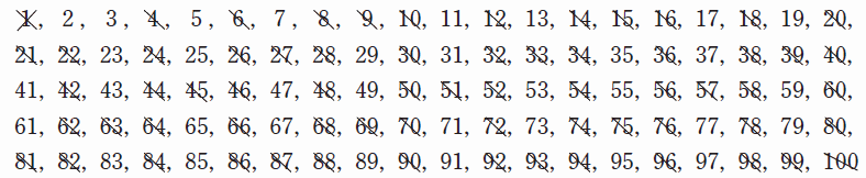 花子さんは1から100までの整数にどのような素数があるのかを調べることにしました。1は素数ではないのでまず1を消し、そのあと2以外の2の倍数、3以外の3の倍数、・・・を次々に消していきました。