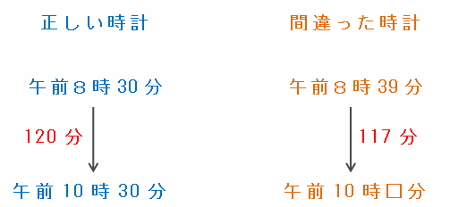 また、40:39を3倍すると120:117になるので、午前8時30分から午前10時30分までの120分間で、この間違った時計は次の図のように117分進みます。