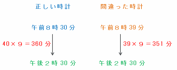 つまり、正しい時計と間違った時計が進む速さの比は8時間:7時間48分=480分:468分=40:39なので、正しい時計が40分進む間に、この間違った時計は39分進む(1分ずつ遅れる)ことが分かります。