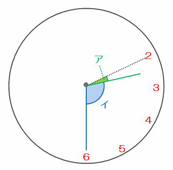 上の図の「2」から「6」までの角度は30×4=120度ですが、短針は2時ちょうどのときに比べて0.5×30=15度進んでいます(緑色のアが15度)。