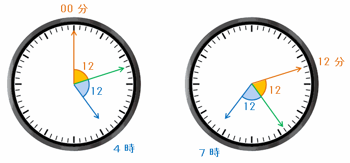 このとき、短針は「4時」の位置からちょうど48÷12=4目盛りの位置に来ているので、この図はバッチリOKです。