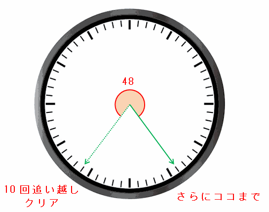 その間、短針は「24分」の位置から「36」分の位置までしか動かないので、第3の針が4時48分のときにいる「36分」の位置からちょうど10周したとき、短針を10回追い抜いたことになります。