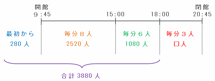 入館待ちの行列に加わる人の数は午後3時からは1分間に6人の割合に、さらに午後6時からは1分間に3人の割合に減りました。最終の入館時刻を厳守するならば、午後何時何分に並ぶ人で行列を終わらせればよいですか。