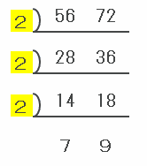 そこで、次の図のような連除法を使って56と72の最大公約数を求めてみると、2×2×2=8mになります。