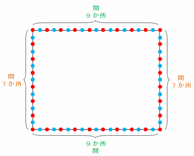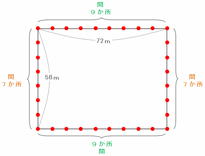 また、横72mに赤い花を8mの間隔で植えるとき、花と花との間は72÷8=9か所なので、コース全体に赤い花を32本植えると次のような図になります。