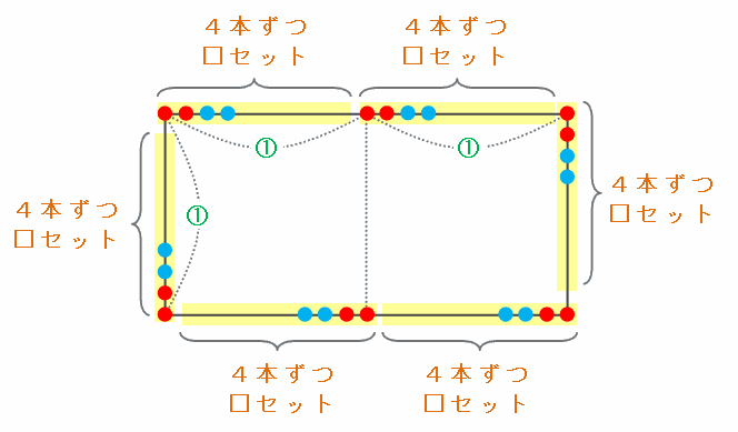 また、この長方形は横の長さが縦の長さの2倍なので、次の図のように長方形の縦の辺に「赤・赤・白・白」の4本を□セット使ったとすると、横の辺には「4本ずつ□セット」を2組並べることになります。