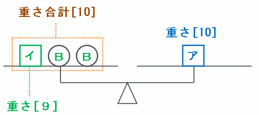 このとき、左側の皿の重さの合計も[10]、そして箱イ1つの重さは[9]なので、 [10]-[9]=[1]がB2枚分の重さにあたります。