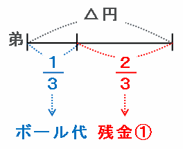 弟→最初の所持金(図の△円)の3分の2が残金の比である1にあたるので、最初の所持金は1÷3分の2=1.5と表せます。