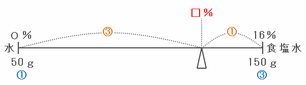 その食塩水に水を50g加えるので、「濃さ0%の食塩水50g」と「濃さ16%の食塩水150g」を混ぜる様子を次のような天秤図に表せばOKです。