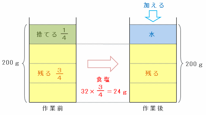 上の図のように、1回目の作業を終えた後の容器の中には、作業前と同じく食塩水が200g入っていますが、食塩の重さは32gから24gに減りました。