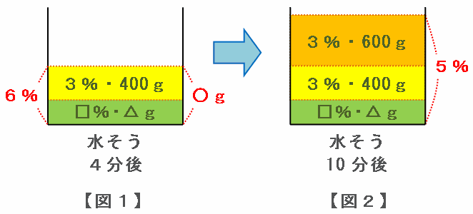 次の図1のように、スタートから4分後には水そうの食塩水の濃度が6%だったのですが、それから6分間で濃さ3%の食塩水を600g追加したので、水そうの食塩水の濃度は図2のように5%へと変化しました。