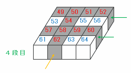 4段目の積み木を右側から見ると、次の図のように「52番」と「60番」は黒い積み木なので、その2行にある4×2=8個の積み木はすべて黒色です。